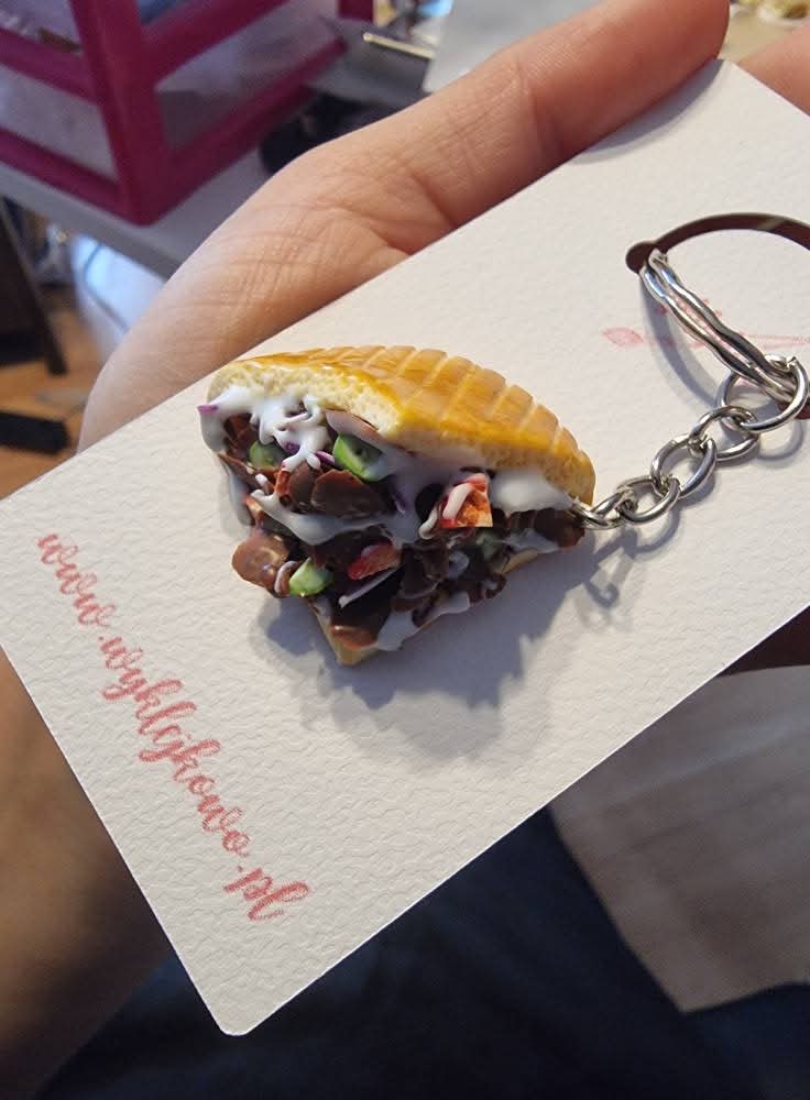 Wyjątkowy breloczek ręcznie wykonany z modeliny i żywicy, który wygląda jak świeżo wyjęty z budki z kebabem! Apetyczny chlebek z grillowanym wzorem skrywa soczyste „mięso”, kolorowe warzywa i kremowy sos – wszystko dopracowane z dbałością o najdrobniejsze detale.