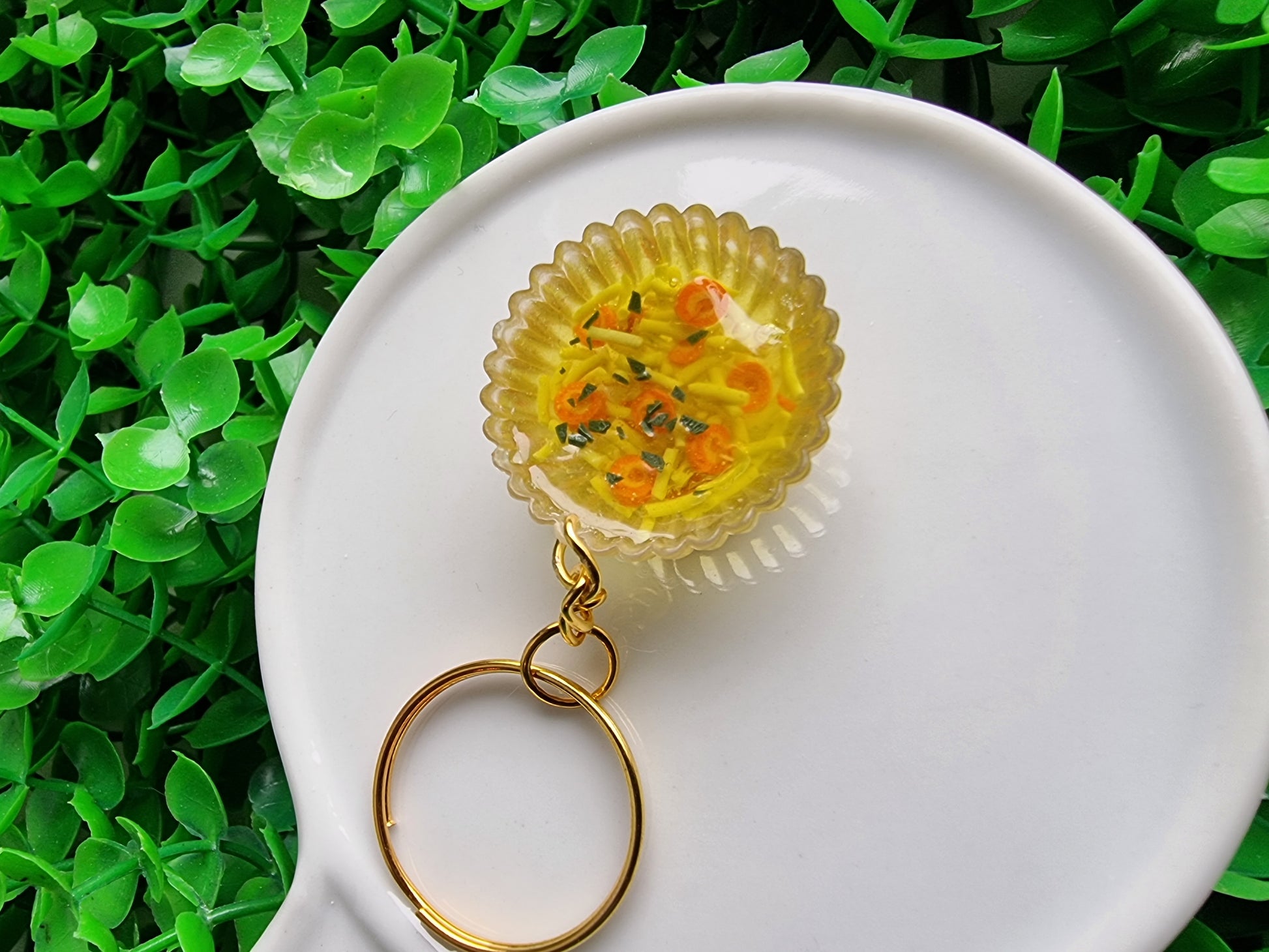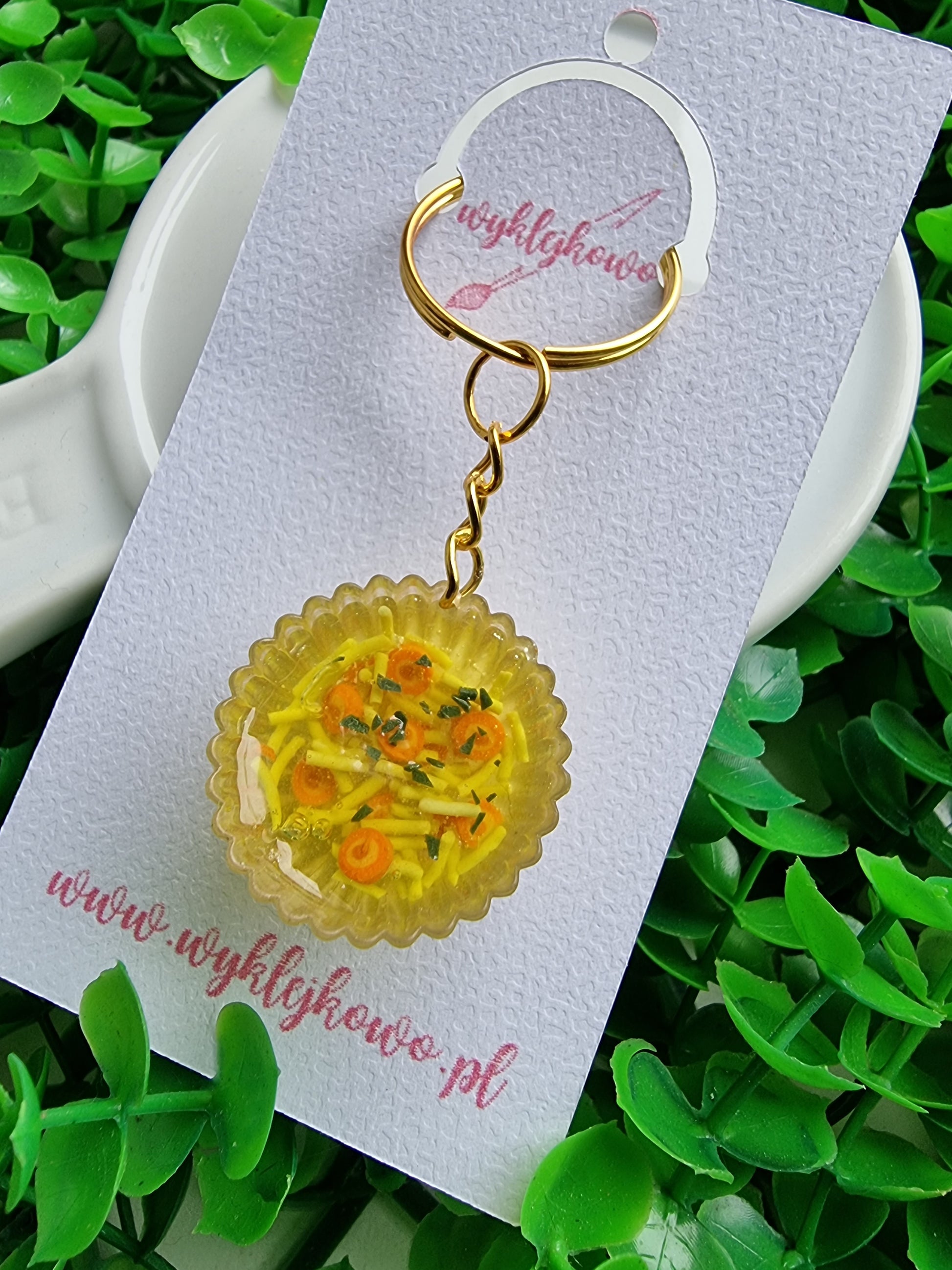Ręcznie wykonany brelok przedstawiający kultową polską zupę – rosół z makaronem. Miniaturowa miseczka z realistycznie odwzorowanym bulionem, plasterkami marchewki i delikatnym makaronem to hołd dla domowego ciepła i smaków dzieciństwa.