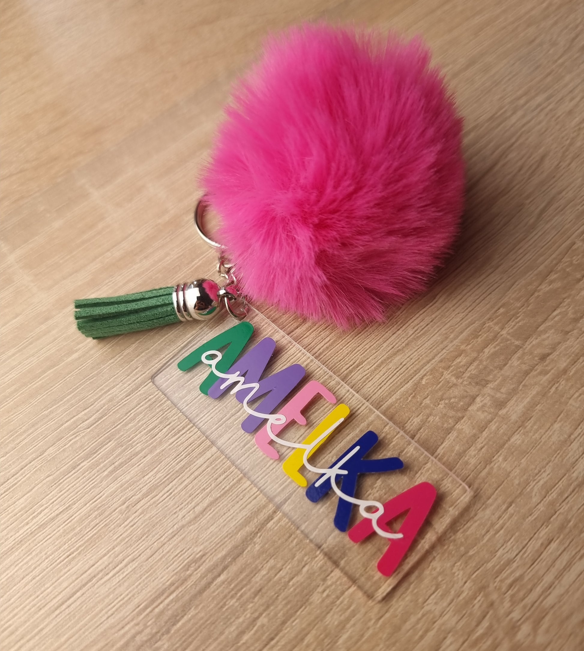 W zestaw wchodzi brelok z pomponem, kolorowy chwost i oczywiście akrylowy brelok z imieniem wykonywany przez nas własnoręcznie.