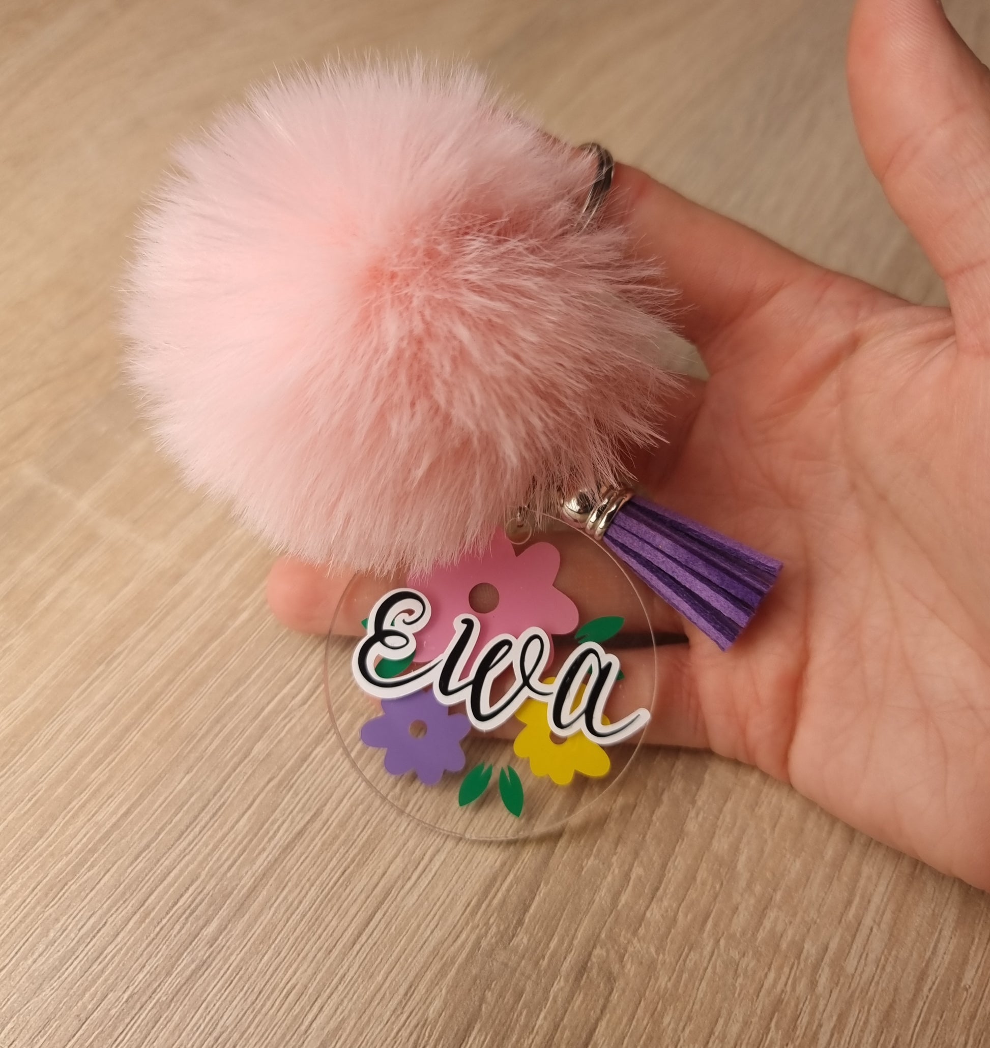 W zestaw wchodzi brelok z pomponem, kolorowy chwost i oczywiście akrylowy brelok z imieniem wykonywany przez nas własnoręcznie.