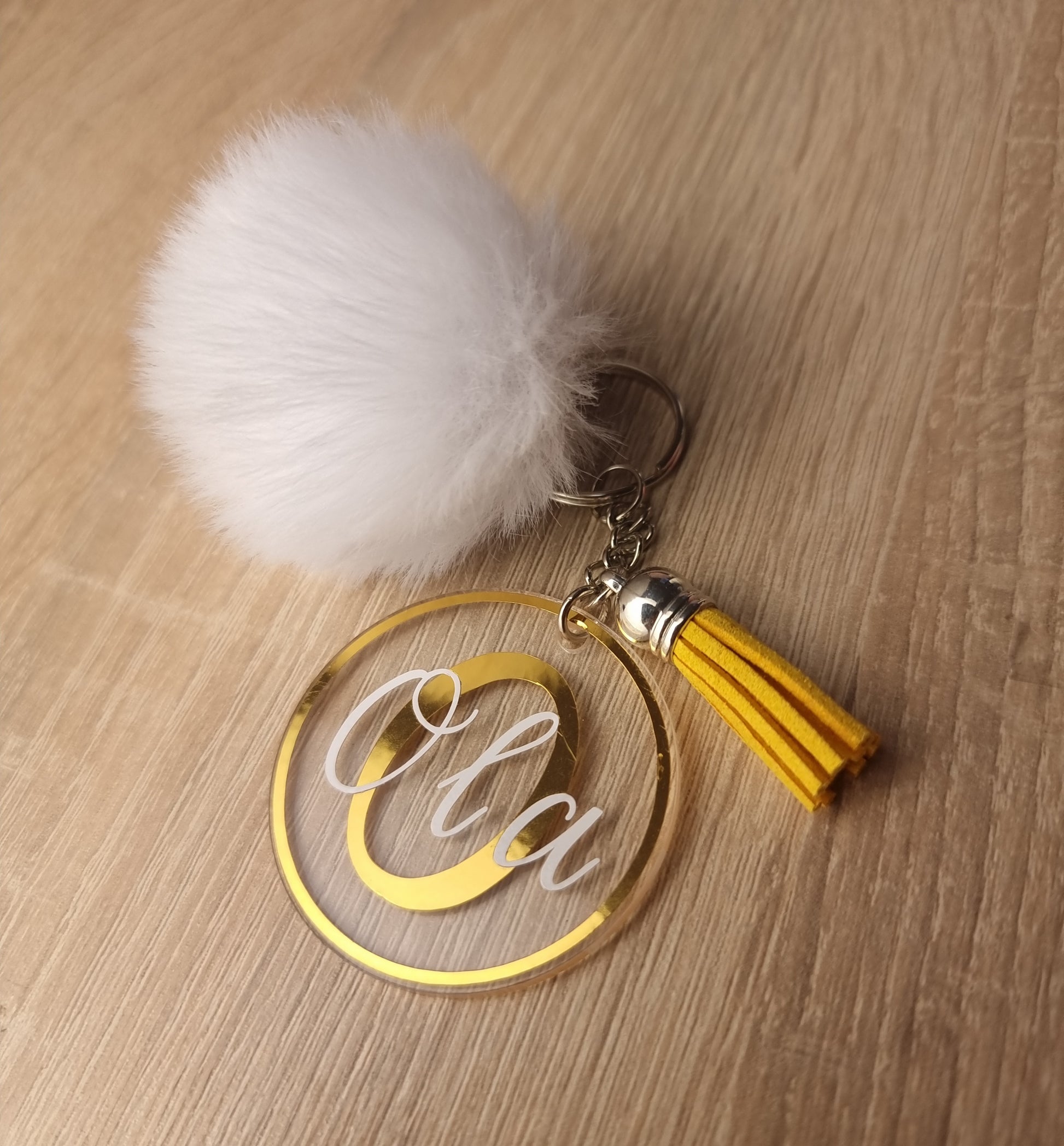 W zestaw wchodzi brelok z pomponem, kolorowy chwost i oczywiście akrylowy brelok z imieniem wykonywany przez nas własnoręcznie.
