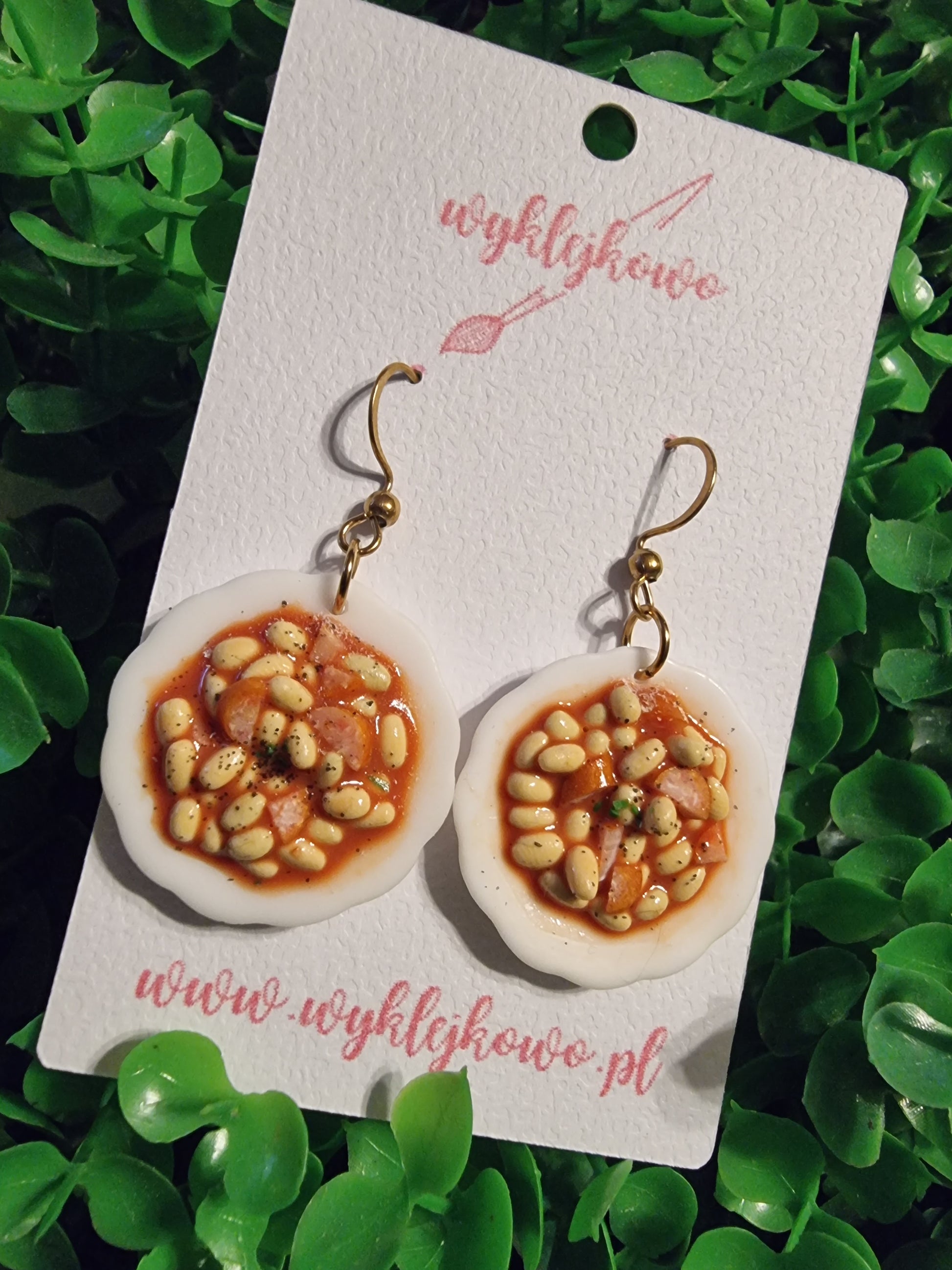 Te nietuzinkowe kolczyki w kształcie klasycznej fasolki po bretońsku to idealny dodatek dla miłośników polskiej kuchni, oryginalnych gadżetów i ręcznie robionej biżuterii z przymrużeniem oka! Miniaturowa porcja fasolki podana na białym talerzyku wygląda niemal jak prawdziwa – widać fasolki, kiełbaskę, gęsty sos pomidorowy i apetyczne przyprawy!