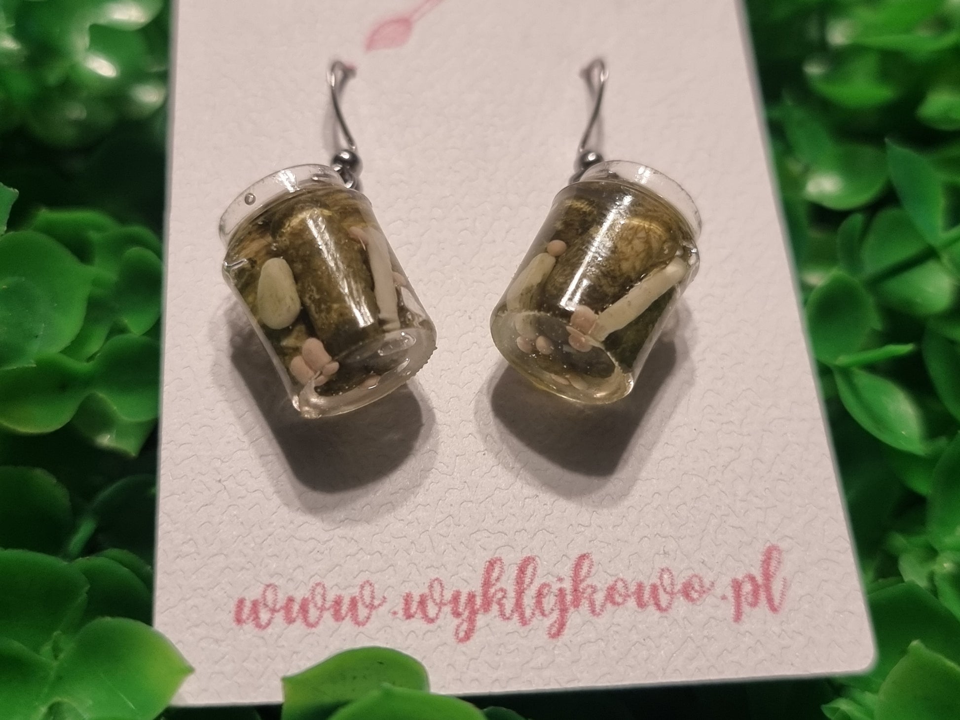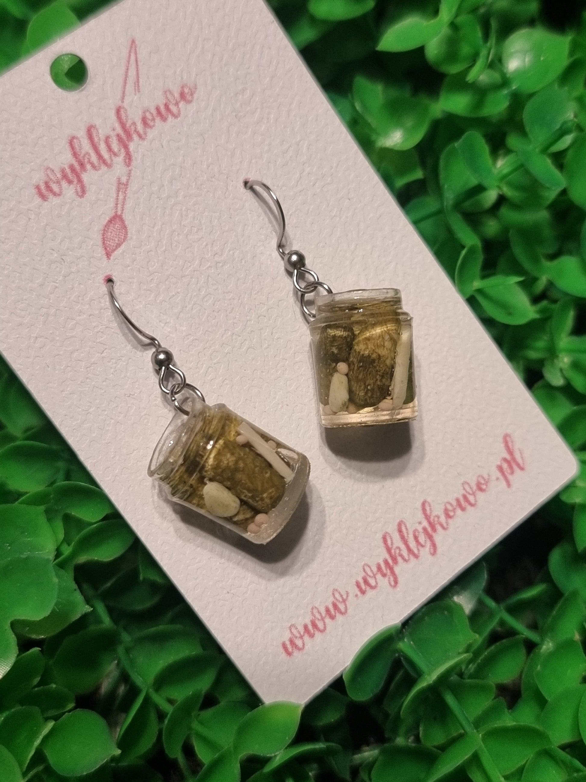Małe słoiki pełne... stylu! Te nietuzinkowe kolczyki z miniaturowymi kiszonymi ogórkami to idealna propozycja dla fanek wiejskich klimatów, tradycji i żartobliwego podejścia do mody. Ręcznie wykonane ogórki, czosnek, ziele angielskie i zalewa zamknięte w miniaturowych słoiczkach wyglądają zaskakująco realistycznie – i rozbrajająco uroczo!