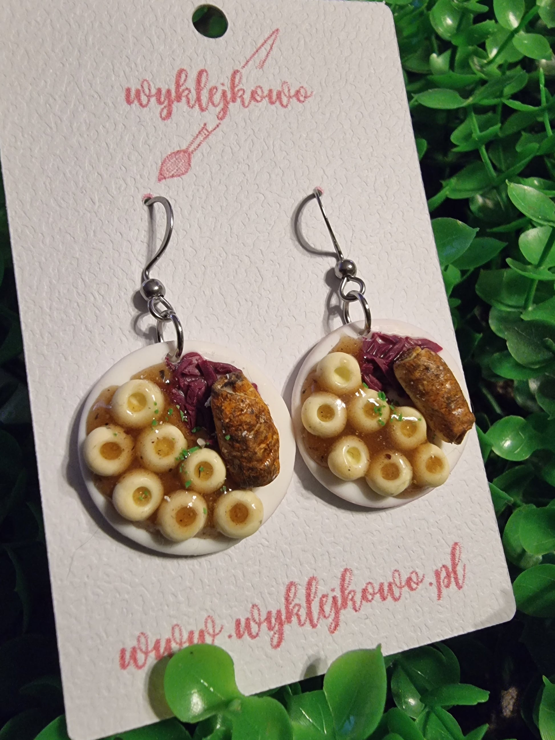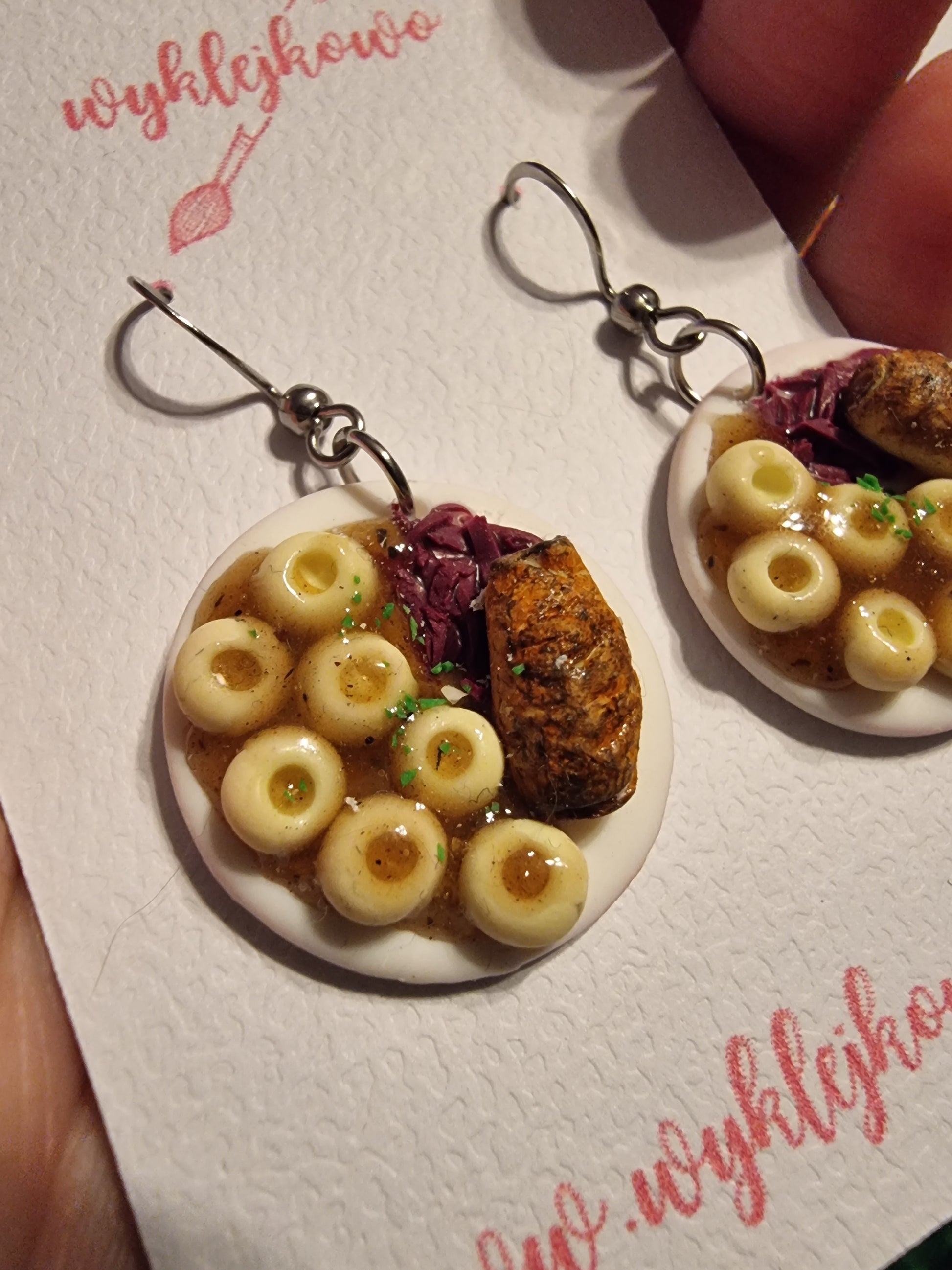 Prawdziwa uczta – tyle że w wersji do noszenia! Te niezwykłe kolczyki przedstawiają klasyczny śląski obiad: kluski śląskie z charakterystycznym wgłębieniem, porcja modrej kapusty, zawijana rolada i porcja ciemnego sosu, wszystko starannie ułożone na miniaturowym talerzyku. To rękodzieło z duszą – idealne dla fanów śląskich smaków, folkloru i oryginalnej biżuterii!