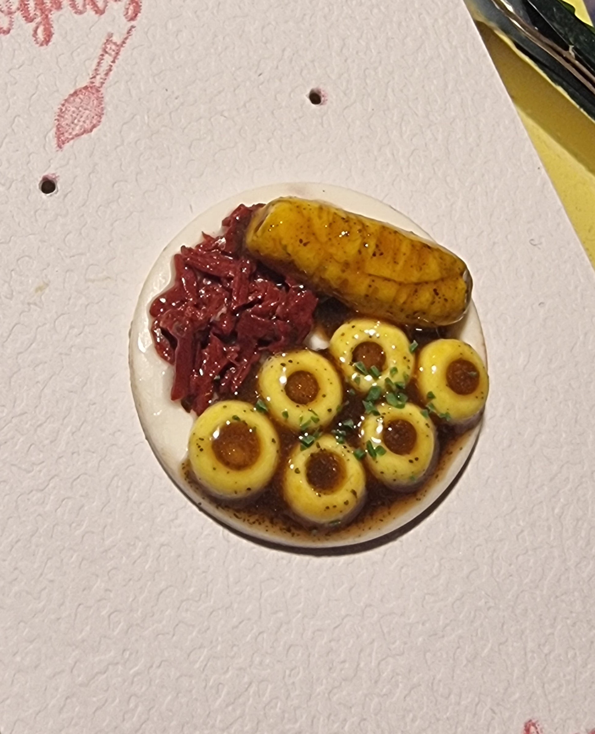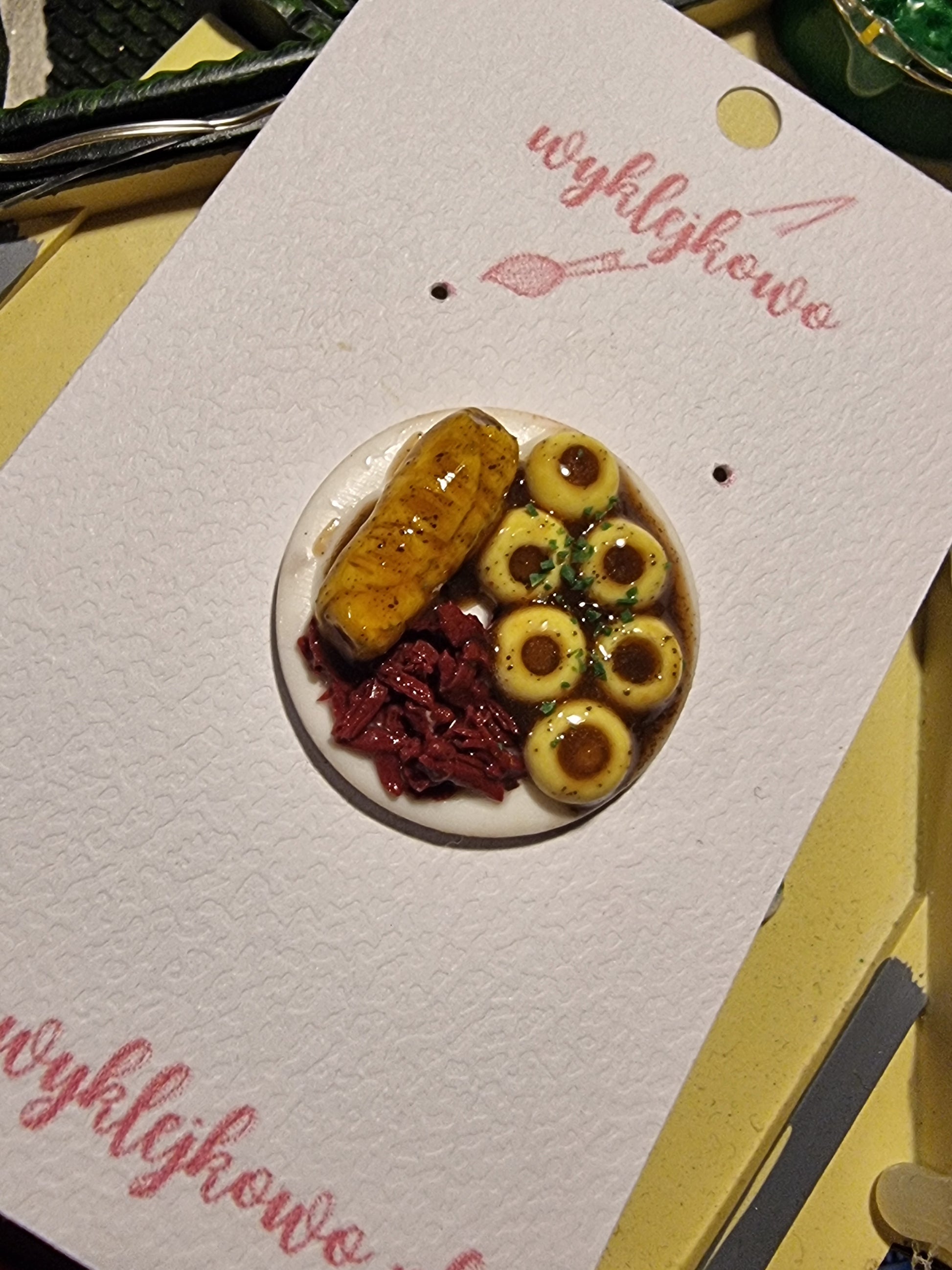 Mała porcja wielkiego smaku! Ten ręcznie wykonany magnes przedstawia klasyczny śląski obiad: pulchną kluskę śląską z charakterystycznym wgłębieniem, soczystą roladę oraz porcję modrej kapusty. Całość ułożona na miniaturowym talerzyku wygląda tak realistycznie, jakby przed chwilą zeszło z niedzielnego stołu. Idealny dodatek do kuchni każdego miłośnika tradycyjnych dań i regionalnego klimatu.